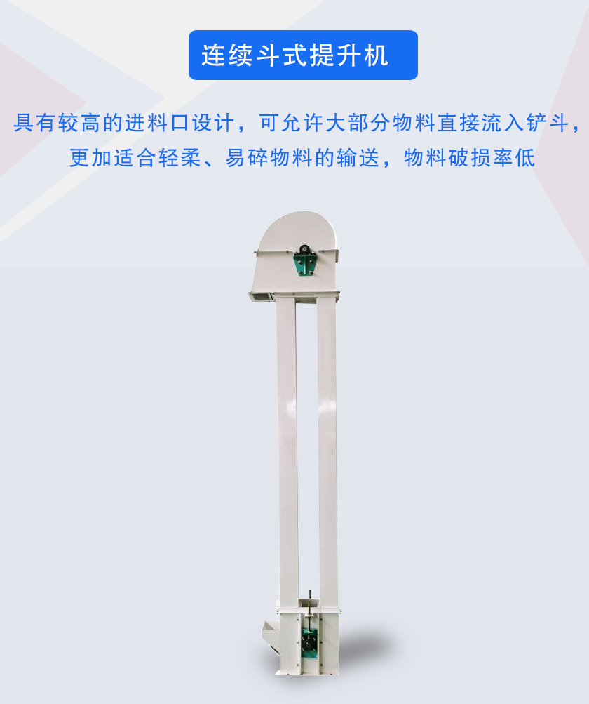連續斗式提升機簡稱連續式提升機,是利用料斗和牽引件進行物料輸送的設備,連續斗式提升機采用比較慢的速度運行,具有較高的進料口設計,可允許大部分物料直接流入鏟斗,更加適合輕柔、易碎物料的輸送,物料破損率低,對于較大和較重的塊狀物和高磨蝕性材料也是理想的選擇,根據牽引件的不同主要分為鏈條式和皮帶式兩種。