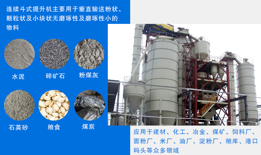連續斗式提升機主要用于垂直輸送粉狀、顆粒狀及小塊狀無磨琢性及磨琢性小的物料,如:水泥、糧食、煤炭、粉煤灰、碎礦石、石英砂、石塊、粘土、化肥等,應用于建材、化工、冶金、煤礦、飼料廠、面粉廠、米廠、油廠、淀粉廠、糧庫、港口碼頭等眾多領域。