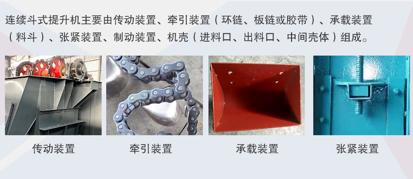 連續斗式提升機主要由傳動裝置、牽引裝置(環鏈、板鏈或膠帶)、承載裝置(料斗)、張緊裝置、制動裝置、機殼(進料口、出料口、中間殼體)組成。