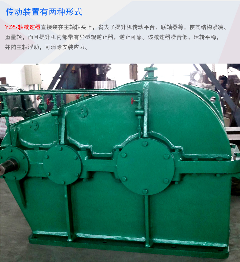傳動裝置有兩種形式,分別配有YZ型減速器、ZQ(或YY)型減速器。YZ型軸減速器直接裝在主軸軸頭上,省去了提升機傳動平臺、聯軸器等,使其結構緊湊、重量輕,而且提升機內部帶有異型輥逆止器,逆止可靠。該減速器噪音低,運轉平穩,并隨主軸浮動,可消除安裝應力。ZQ型減速器工作環境溫度為-40℃到+40℃,轉速不大于1500轉/分,齒輪傳動圓周速度不大于10米/秒,此種類型的減速器強度高,齒面磨損小,使用壽命長。