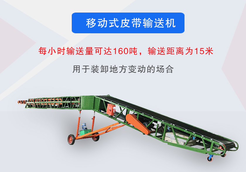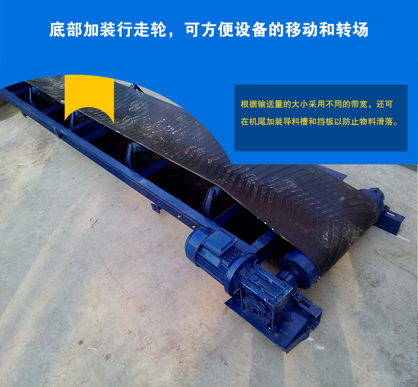 移動式皮帶輸送機是底部加裝了行走輪,移動方便,可根據現場向下輸送物料,也可用戶傾斜輸送,移動式皮帶輸送機可加裝擋料板來防止物料滑落.