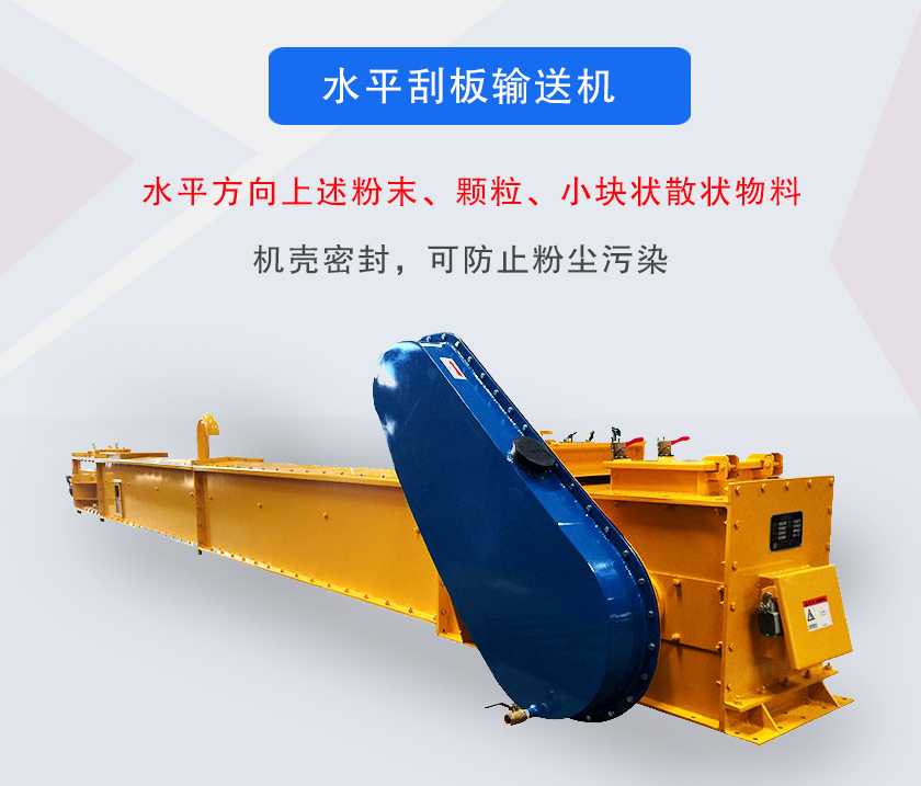 水平刮板輸送機是指水平方向上輸送粉狀及顆粒狀物料的設備,可單點或多點進料,出料,水平刮板輸送機分為普通型、密封型和特殊型三類,采用密封式設計,可防止粉塵污染.