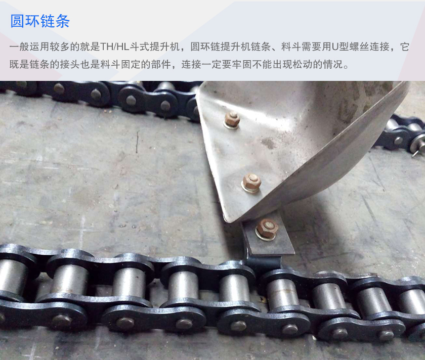 圓環鏈條:一般運用較多的就是TH/HL斗式提升機,圓環鏈提升機鏈條、料斗需要用U型螺絲連接,它既是鏈條的接頭也是料斗固定的部件,連接一定要牢固不能出現松動的情況。