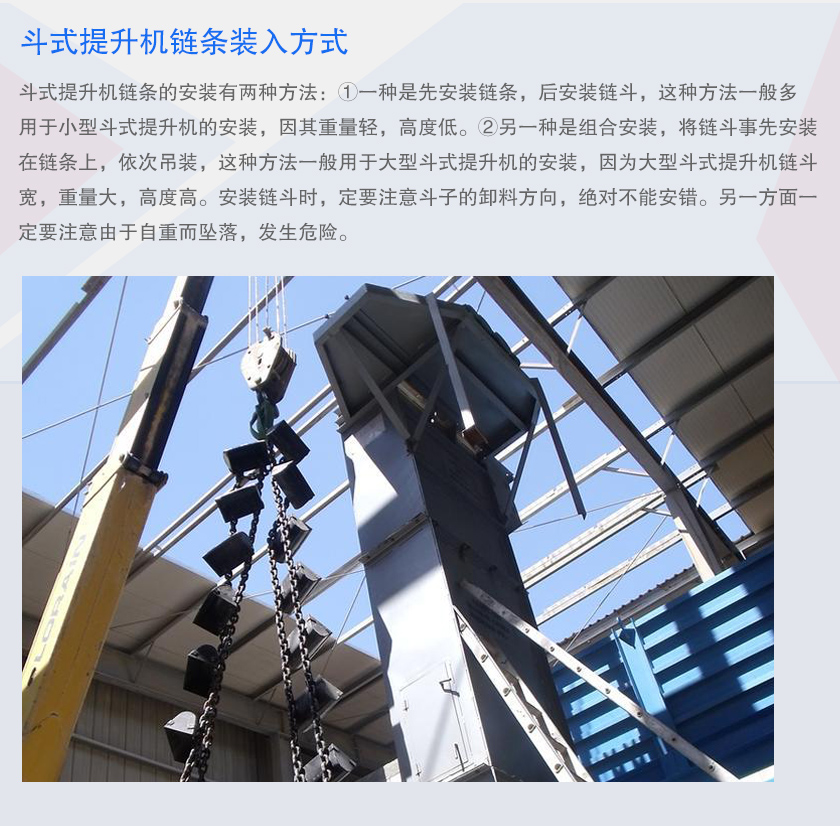 斗式提升機鏈條的安裝有兩種方法:①一種是先安裝鏈條,后安裝鏈斗,這種方法一般多用于小型斗式提升機的安裝,因其重量輕,高度低。②另一種是組合安裝,將鏈斗事先安裝在鏈條上,依次吊裝,這種方法一般用于大型斗式提升機的安裝,因為大型斗式提升機鏈斗寬,重量大,高度高。安裝鏈斗時,定要注意斗子的卸料方向,不能安錯。另一方面一定要注意由于自重而墜落,發生危險。