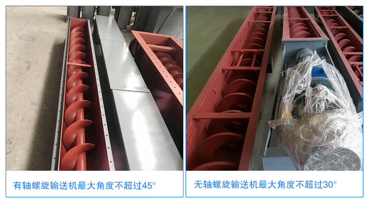 有軸螺旋輸送機角度不超過45°,有軸螺旋輸送機因機體有軸分布,輸送物料相對無軸少。