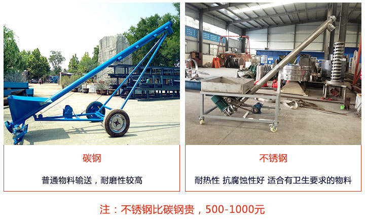 移動螺旋輸送機分為碳鋼和不銹鋼兩種,同一型號下,碳鋼材質的移動螺旋輸送機會比不銹鋼材質的便宜500-1000元。