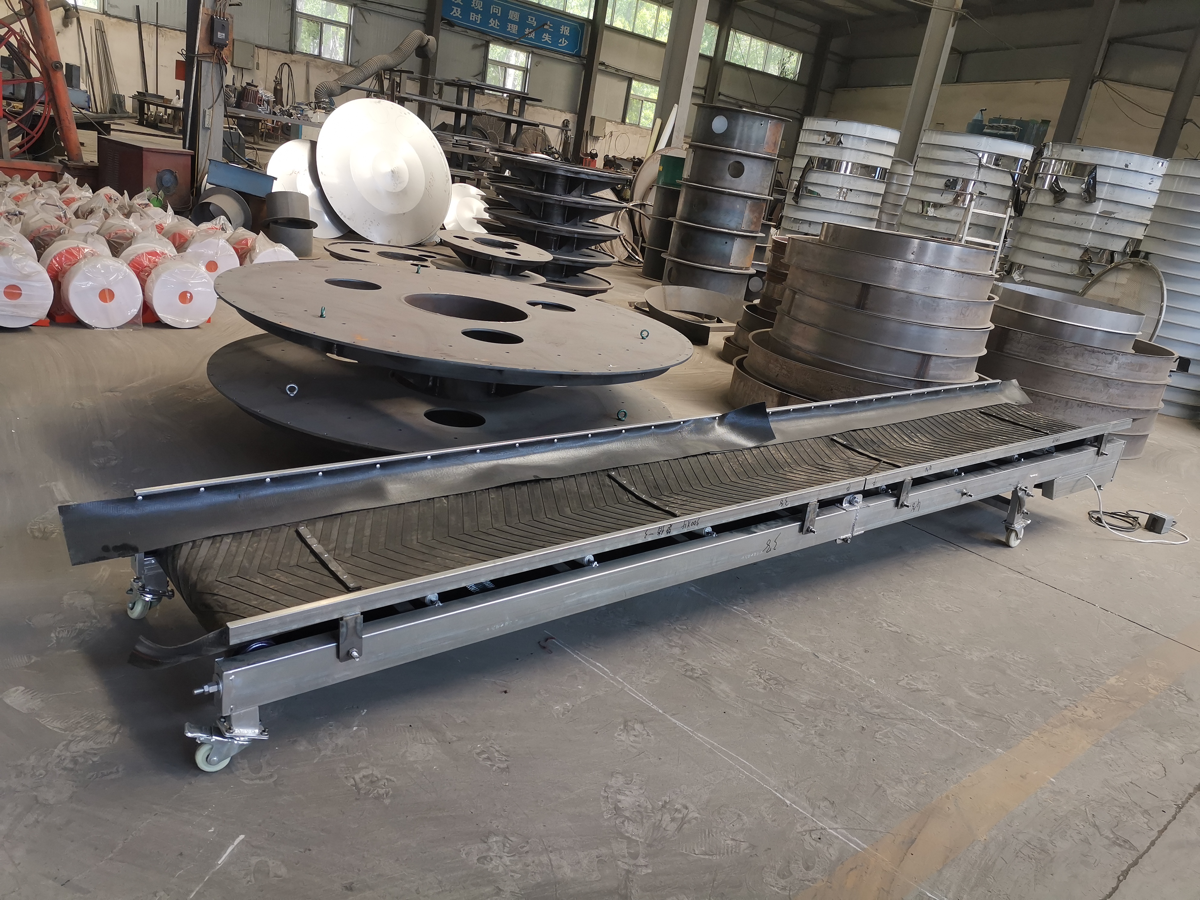 水平皮帶輸送機可以在移動的水平輸送線上形成從初始進料點到最終卸料點的物料輸送過程,主要用于港口、碼頭、車站、煤場、倉庫、建筑工地、采砂場等頻繁更換的裝卸站的短途運輸,以及100kg以下的散裝物料和產品的裝卸,可單機輸送,也可多機組合輸送。