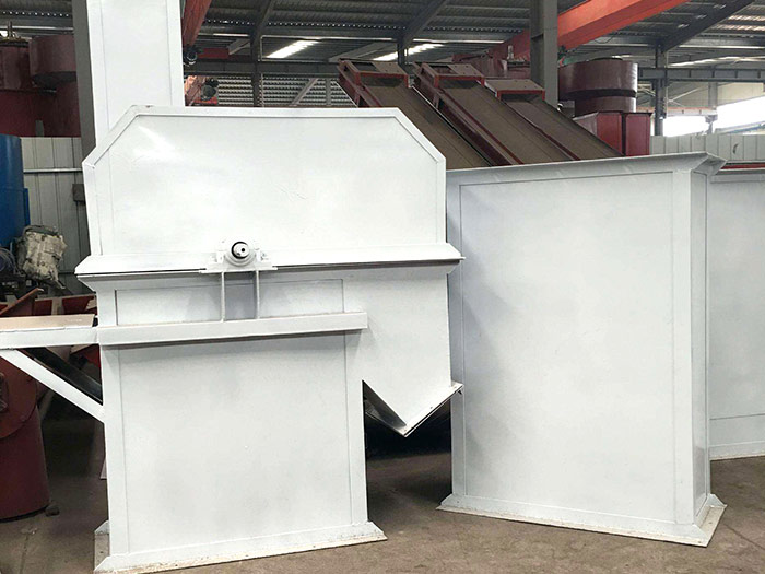 斗式提升機由殼體、牽引件(輸送鏈)、料斗、驅(qū)動輪(頭輪)、改向輪(尾輪)、張緊裝置、導(dǎo)向裝置、加料口(入料口)和卸料口(出料口)。