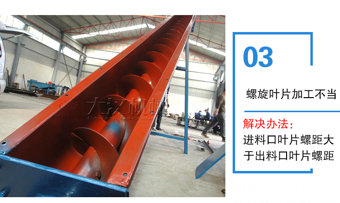解決辦法:控制螺旋葉片與管壁間隙單邊在2mm以內,盡里抑制物料從底部間隙流向出料口。縮小內外界壓差,可采取螺旋軸的變節距設計,即進料口葉片螺距大于出料口葉片螺距.這樣就能使物料越走越緊。