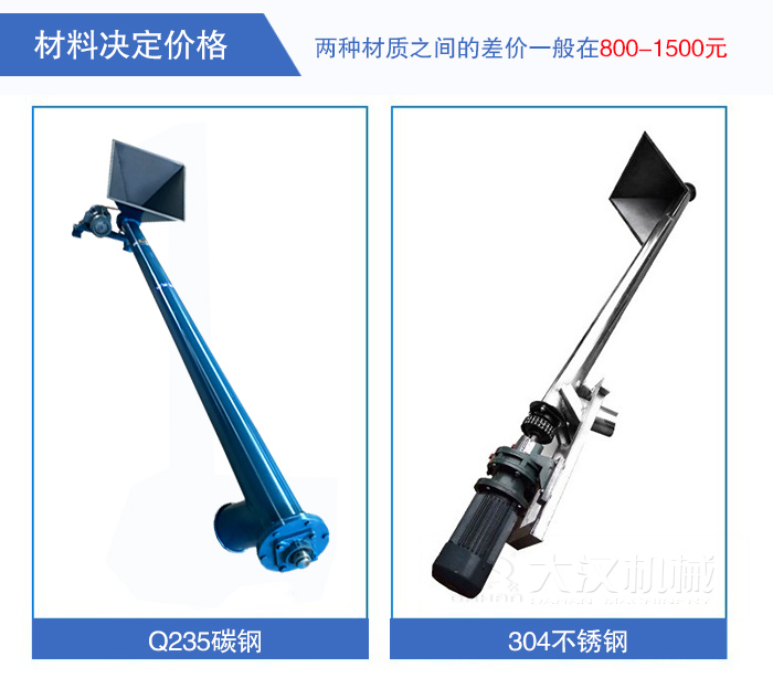 螺旋輸送機殼體有Q235碳鋼,304不銹鋼,這兩個之間的差價一般在800-1500元。另外,選擇不同配件價格也會不同,舉例來說,采用普通電機的輸送機價格比防爆電機的輸送機價格便宜,所以用戶在選擇時需要結合自身情況。