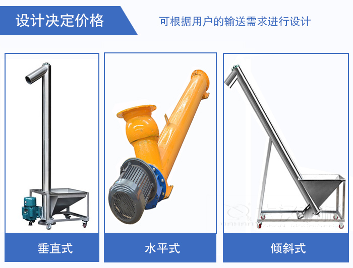 螺旋輸送機根據用戶的要求可以設計成垂直式的、水平式、傾斜式的,可根據用戶的輸送需求進行設計,由于設計與產品的制造工藝有關,每個廠家對于螺旋輸送機的工藝不同,這就決定了螺旋輸送機價格的高低。