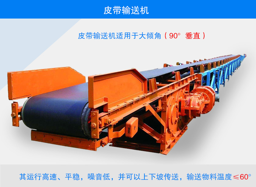 皮帶輸送機適用于大傾角(90°垂直)連續或間歇運動來輸送100KG以下的物品或粉狀、顆狀物品,其運行高速、平穩,噪音低,并可以上下坡傳送,輸送物料溫度≤60°。帶式輸送機用于井下采礦工程、露天采礦、大型自卸船、鋼廠的高爐上料等場合。