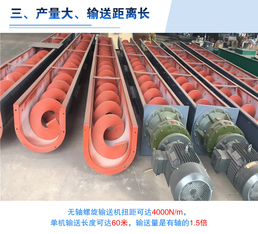 對于污泥輸送來說,用戶也比較關系設備的輸送效率,無軸螺旋輸送機扭距可達4000N/m,單機輸送長度可達60米,輸送量是有軸的1.5倍,另外還可根據用戶需要,采用多級串聯式安裝,對污泥進行超長距離的輸送。