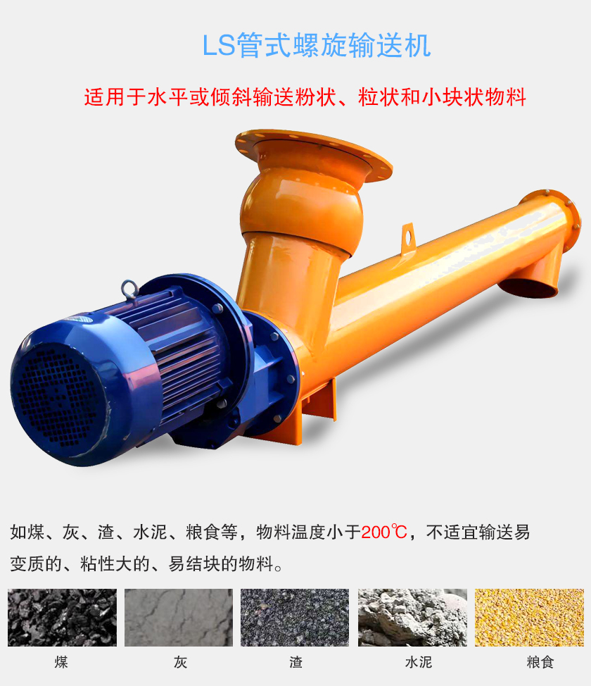 LS管式螺旋輸送機適用于水平或傾斜輸送粉狀、粒狀和小塊狀物料,如煤、灰、渣、水泥、糧食等,物料溫度小于200℃,不適宜輸送易變質的、粘性大的、易結塊的物料。