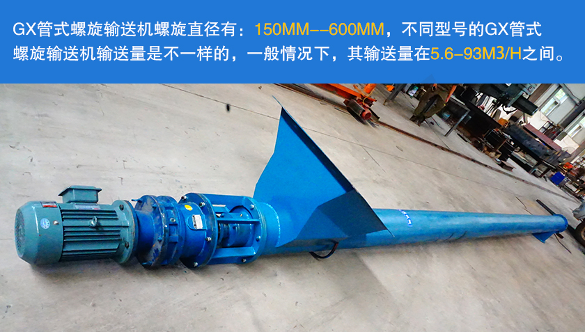 GX管式螺旋輸送機螺旋直徑有:150mm,200mm,250mm,300mm,400mm,500mm,600mm,不同型號的GX管式螺旋輸送機輸送量是不一樣的,一般情況下,其輸送量在5.6-93m³/h之間。