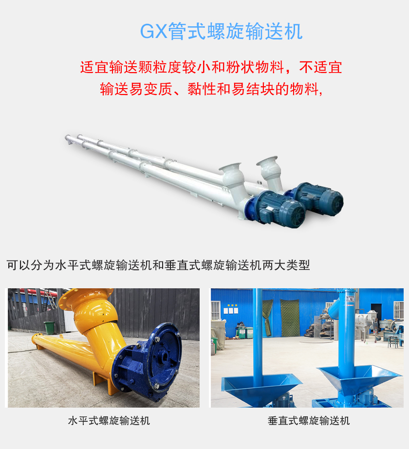 GX型管式螺旋輸送機是按照JB/T679-95《螺旋輸送機》標準設計制造,是LS型螺旋輸送機的換代產品,適宜輸送顆粒度較小和粉狀物料,不適宜輸送易變質、黏性和易結塊的物料,可以分為水平式螺旋輸送機和垂直式螺旋輸送機兩大類型。