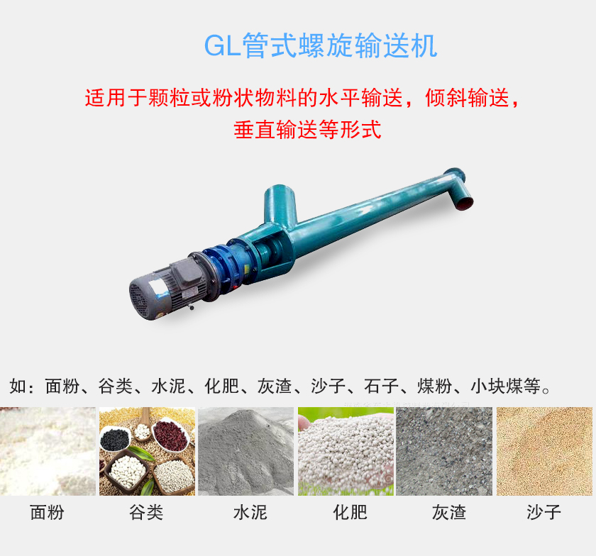 GL管式螺旋輸送機適用于顆粒或粉狀物料的水平輸送,傾斜輸送,垂直輸送等形式,如:面粉、谷類、水泥、化肥、灰渣、沙子、石子、煤粉、小塊煤等。